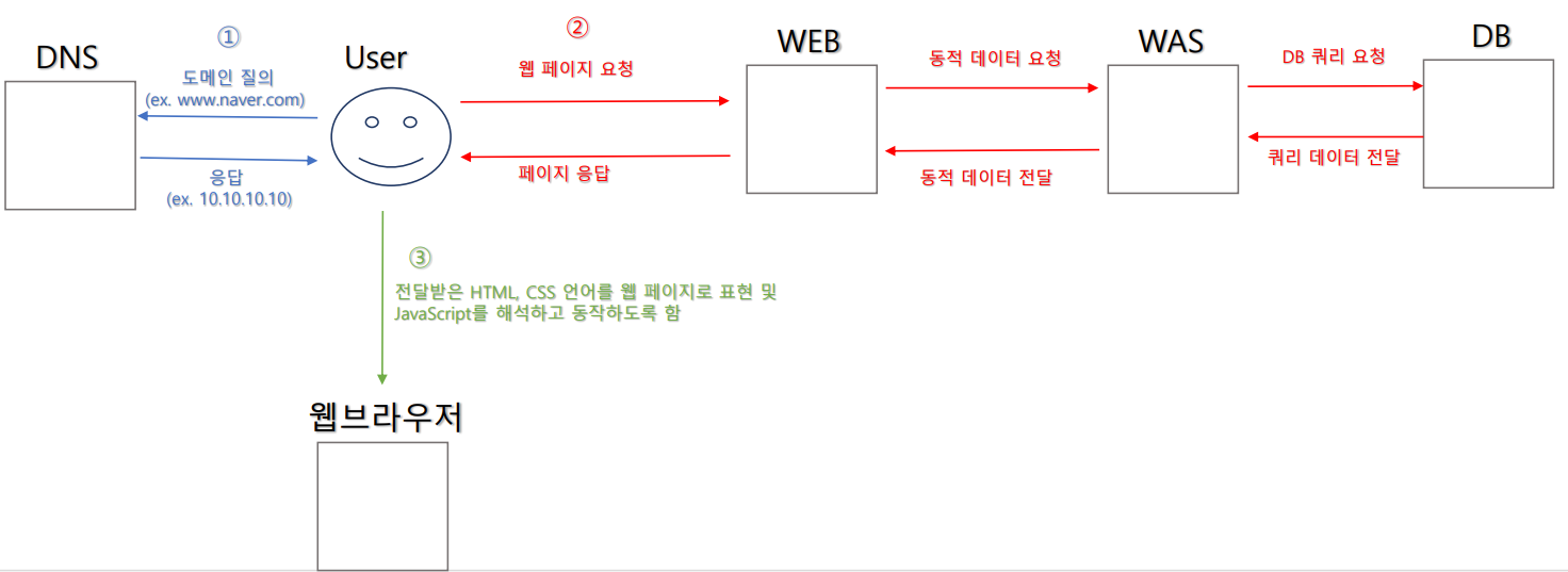 - WAS : DB와 통신하여 동적인 컨텐츠를 처리하기 위한 서버 DB : 데이터를 관리하기 위한 서버