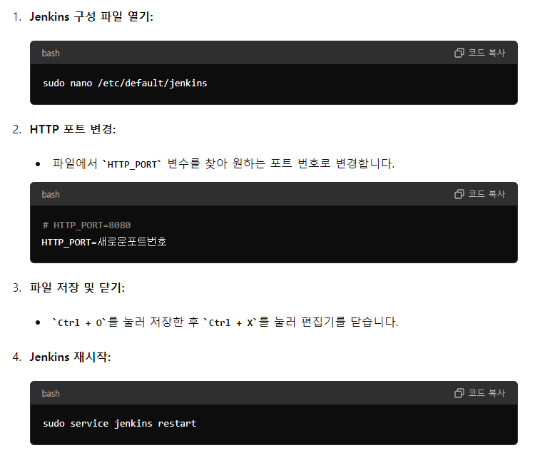 젠킨스의 기본포트는 8080번 포트를 사용 -> 다른 프로그램의 경우에도 많이 사용해 충돌할 가능성이 높다