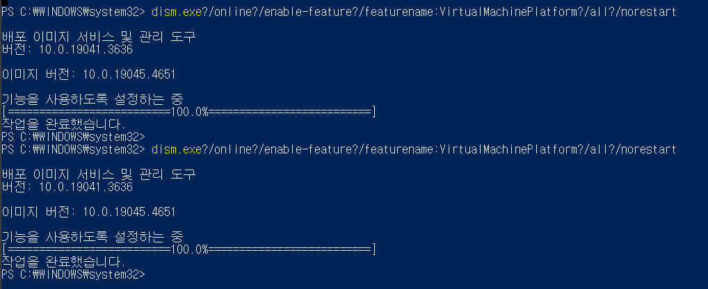 dism.exe /online /enable-feature /featurename:VirtualMachinePlatform /all /norestart