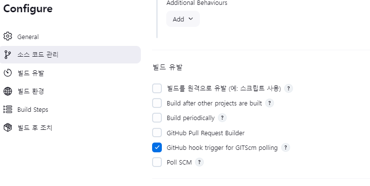 빌드유발 → GitHub hook trigger for GITScm polling 선택