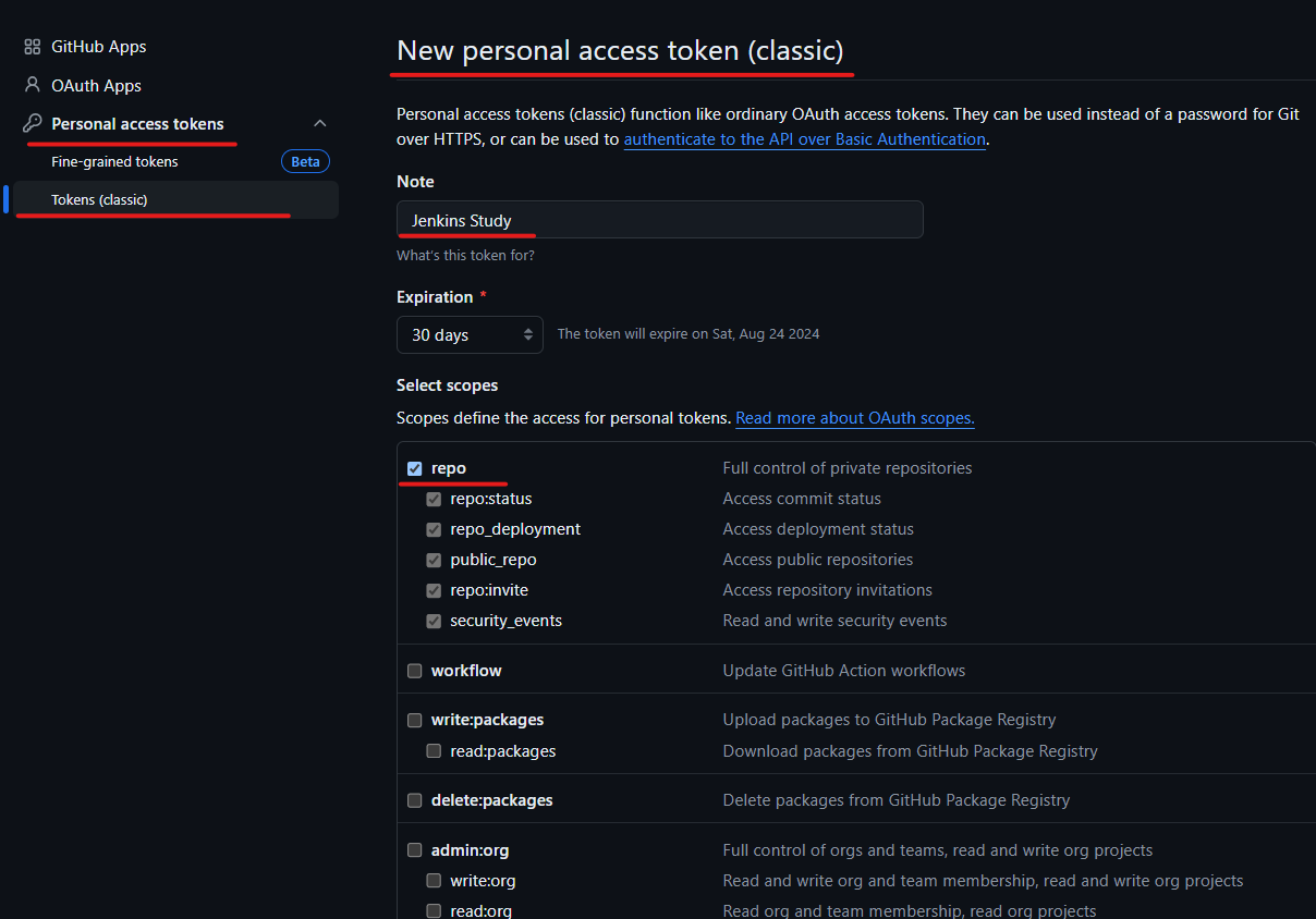 **** 토큰은 생성후 바로 복사해서 저장해 두어야 한다!!! 새로고침 하자마자 사라진다