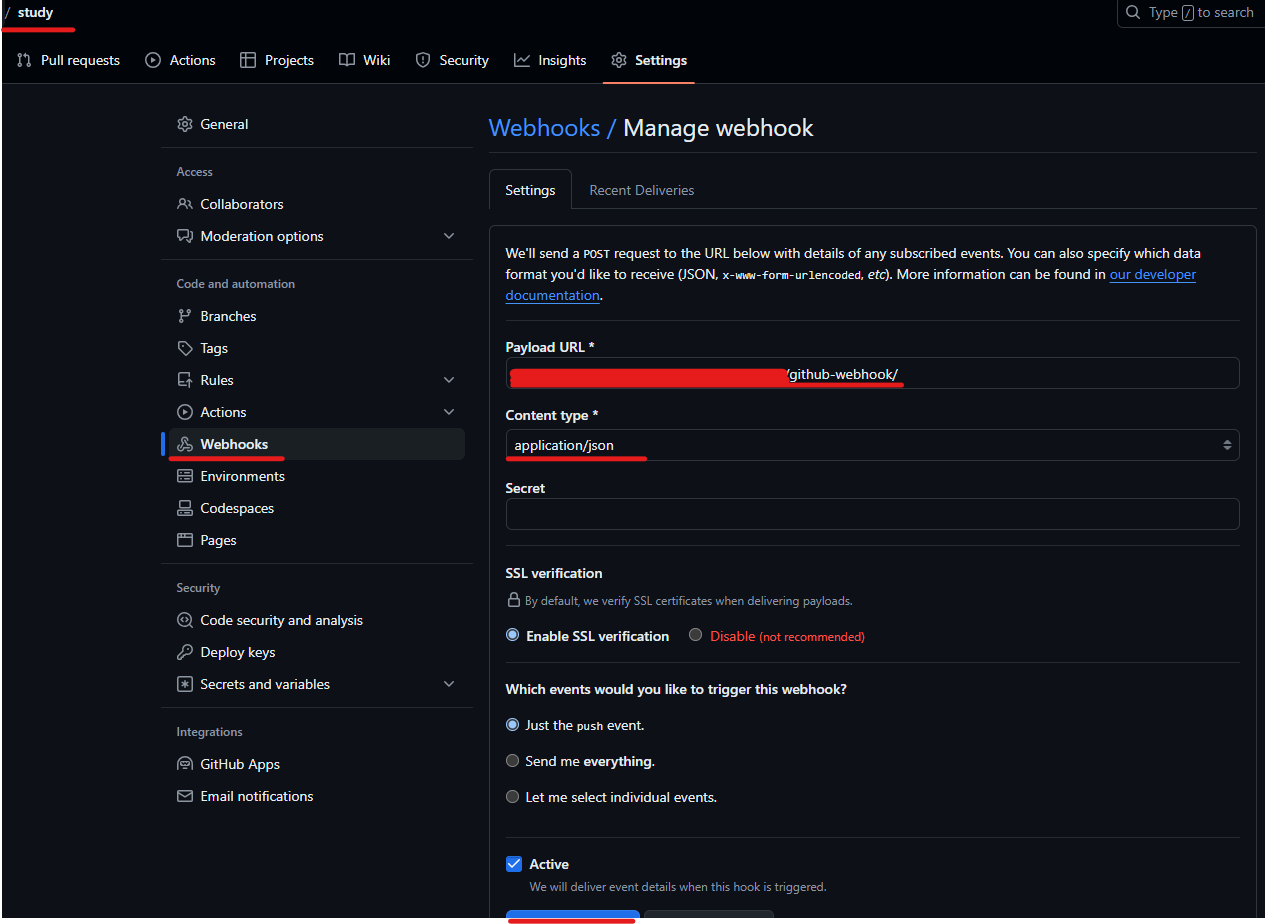 payload URL : 젠킨스주소 + /github-webhook/