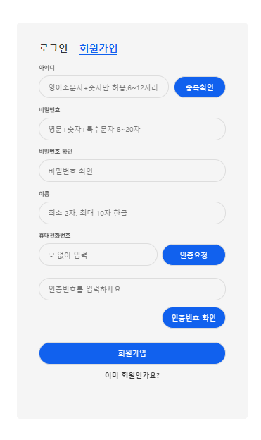 if (!isIdValid || !isPwdValid || !isNameValid || !isVerified) { // 하나라도 false가 있으면 폼 제출 막음