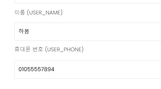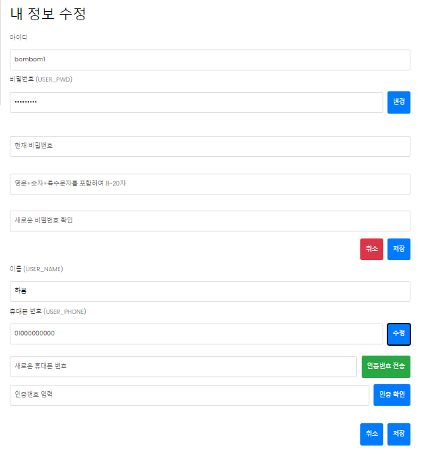 내정보에서 아이디,비밀번호,이름,휴대폰 번호 이렇게 4가지의 정보를 나타냈고, 아래와 같이 작업을 진행 했다.
