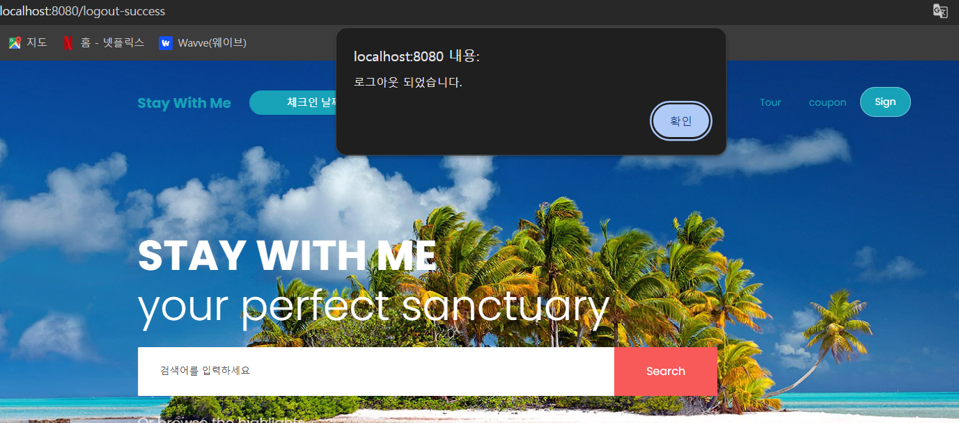즉, 아래 이미지와 같이 사용자에게 로그아웃 메시지를 표시하고, 메인 화면으로 이동하는 기능이다!